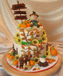 I was asked to do another harvest themed cake - this time for a married couple who have October/November birthdays and were sharing a party. I was supposed to take the blue harvest cake I did a couple weeks ago and make it a bit more "adult" friendly while keeping it similar. I have been wanting to do a cake with a tree growing up the front face for a while now, so I figured now was as good a time as any. Twenty hours worth of sculpted fondant later, I came up with this. Couldn't decide whether to put the chicken down by the ear of corn or up on top of her nest, so I left her "loose" instead of glueing her down with chocolate (the way everything else was glued down). Not much in this world is more fun that an interactive cake you can play with. Ok, that IS kinda' gross if you think about it - and I heard today from the girl who asked me to bake this cake that someone at the party considered eating the chicken and then had second thoughts after she realized half the town had played with it.