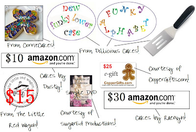 - Dillicious Cakes: $40 gift set including upper and lower case funky tappits and Pampered Chef spatula